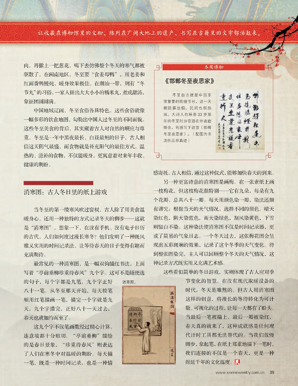 这些看似简单的冬日游戏,实则体现了古人应对季节变化的智慧。在没有现代取暖设备的时代,冬天是难熬的。但古人用消寒图这样的创意,将漫长的等待转化为可计数、可视化的过程,让每一天都有了盼头。当最后一笔被描上,最后一瓣被染红,春天真的就来了,这种成就感是任何现代计时工具都无法替代的。当我们放慢脚步,拿起笔,在纸上郑重地描下一笔时,我们连接的不仅是一个春天,更是一种绵延千年的文化温度。