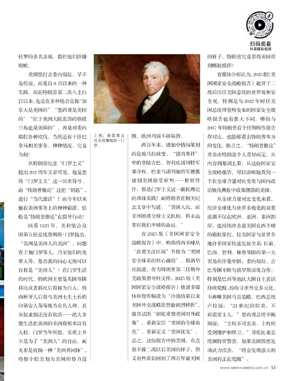 从特朗普纪念“门罗主义”提出202周年文章可见,他是想将“门罗主义”这一历史符号,由“特朗普推论”这把“钥匙”,进行“当代激活”!而今年以来他在美洲事务上的种种做派,恰恰是“特朗普推论”在指导行动!