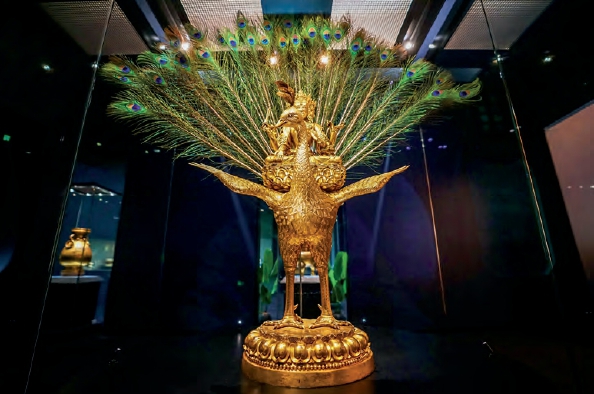 在展览的第三单元“永宣垂范、震古耀今”里,“永宣金铜造像”与“宣德炉”也是明代工艺美术的杰出代表。永乐、宣德两朝制作的宫廷造像以其鲜明的风格特征、标准的款识格式,呈现出一种崭新的造像艺术形式,为中国金铜造像的巅峰之作。以皇帝年号命名的“宣德炉”,成为铜胎细腻精美、结合鎏金、嵌金银与洒金之高超工艺技术的铜炉代称。本单元特别展出大都会艺术博物馆藏明永乐铁鋄金银天杖、柏林民族学博物馆藏明宣德铜鎏金孔雀明王像、青海省博物馆藏明宣德赐瞿昙寺鎏金铜瓶等作品。