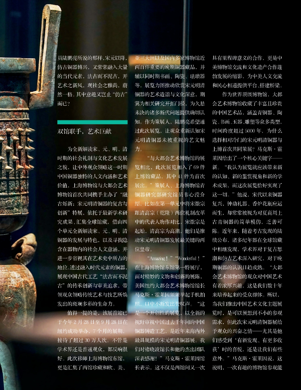 “Amazing!”“Wonderful!”在上海博物馆东馆第一特展厅,面对精妙的文物和创新的展陈,美国纽约大都会艺术博物馆馆长马克斯·霍莱因频频举起手机拍照,口中不断发出赞叹声。“这是一个开创性的展览,以全新的视野审视中国过去千年间的中国铜器铸造工艺,是近年来海内外最具规模的宋元明清铜器展。我们对褚晓波馆长和他的杰出团队深表感谢!”马克斯·霍莱因馆长表示,这不仅是两馆间又一次具有里程碑意义的合作,更是中美博物馆交流和文化遗产合作蓬勃发展的缩影,为中美人文交流和民心相通提供平台、搭建桥梁。