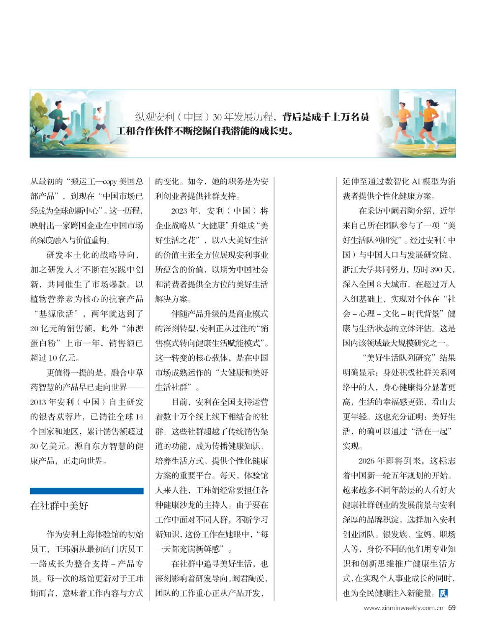 近日,《新民周刊》记者与三位身处不同岗位的安利员工展开对话。他们的职场故事,如同秋日暖阳映照水面,光润之中泛起层层涟漪——既是个体的成长诗篇,也成为安利在华三十年发展策略的生动注脚。