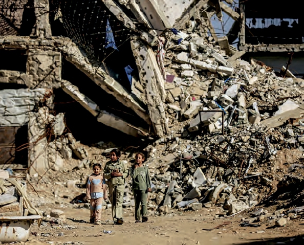 巴勒斯坦流离失所的儿童在以色列袭击留下的废墟中艰难维持日常生活。加沙地带人道主义危机进一步加深。
