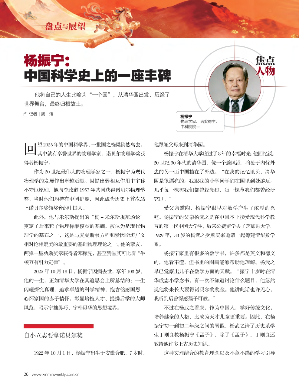 2025年10月18日,杨振宁因病去世,享年103岁。他的一生,正如清华大学在其追思会上所总结的:一生闪耀探究真理、追求卓越的科学精神,饱含铭感国恩、心怀家国的赤子情怀,彰显培植人才、提携后学的大师风范,昭示宁拙毋巧、宁朴毋华的思想境界。