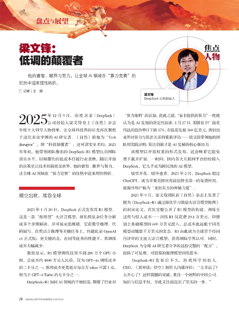 2025年12月9日,深度求索(DeepSeek)公司创始人梁文锋登上《自然》杂志年度十大科学人物榜单,让全球科技界的目光再次聚焦于这位来自中国的AI研究者。《自然》称他为“Tech disruptor”,即“科技颠覆者”,这可谓实至名归:2025年年初,他带领团队推出的DeepSeek-R1模型比肩国际顶尖水平,以颠覆性的低成本打破行业垄断,随后开源的决策更让技术创新惠及世界。他的睿智、眼界与努力,让全球AI领域在“算力竞赛”的狂热中迎来理性转折。