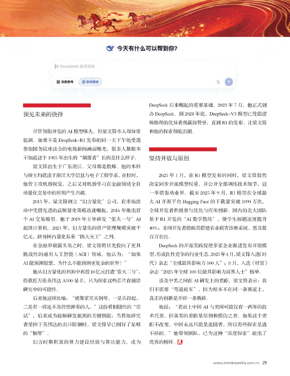 DeepSeek的开源实践促使多家企业跟进发布开源模型,形成良性竞争的行业生态。2025年4月,梁文锋入选《时代》杂志“全球最具影响力100人”;8月,入选《财富》杂志“2025年全球100位最具影响力商界人士”榜单。