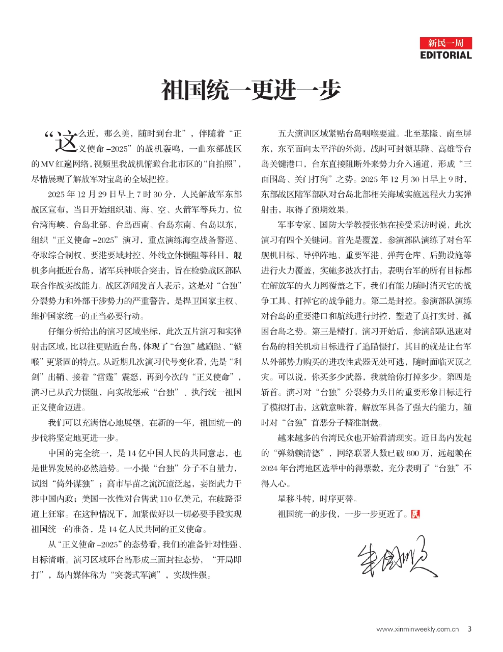中国的完全统一,是14亿中国人民的共同意志,也是世界发展的必然趋势。一小撮“台独”分子不自量力,试图“倚外谋独”;高市早苗之流沉渣泛起,妄图武力干涉中国内政;美国一次性对台售武110亿美元,在歧路歪道上狂窜。在这种情况下,加紧做好以一切必要手段实现祖国统一的准备,是14亿人民共同的正义使命。