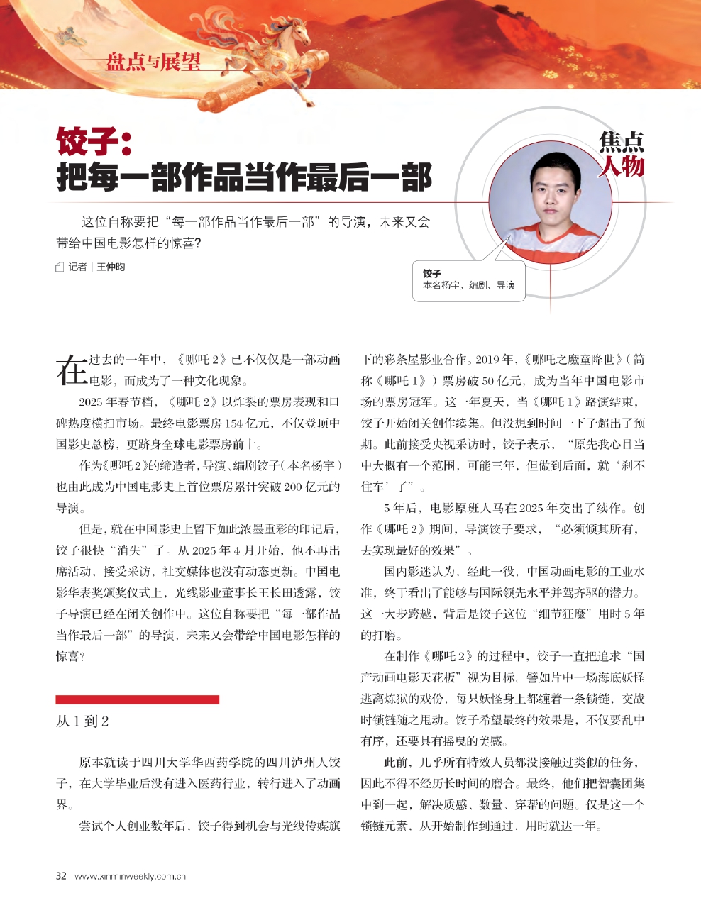 但是,就在中国影史上留下如此浓墨重彩的印记后,饺子很快“消失”了。从2025年4月开始,他不再出席活动,接受采访,社交媒体也没有动态更新。中国电影华表奖颁奖仪式上,光线影业董事长王长田透露,饺子导演已经在闭关创作中。这位自称要把“每一部作品当作最后一部”的导演,未来又会带给中国电影怎样的惊喜?