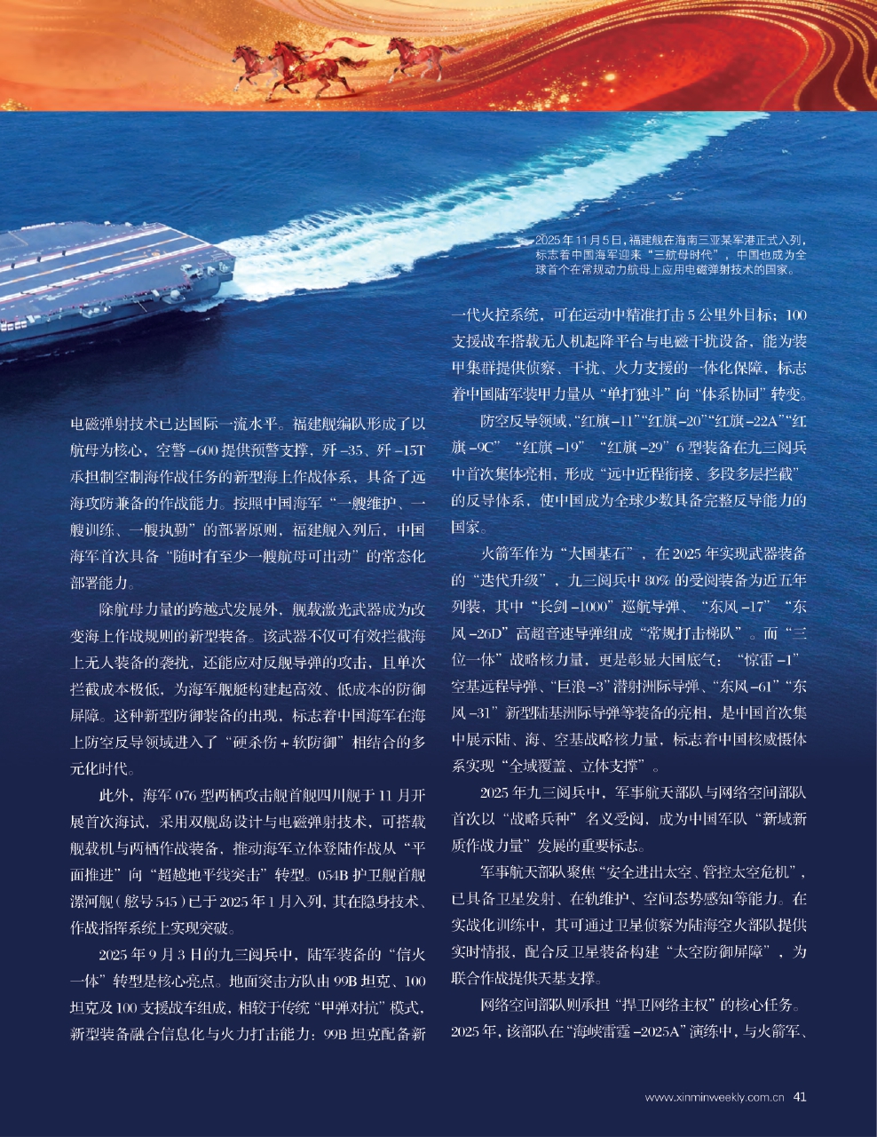 2025年,是中国军队建设“十四五”规划的收官之年,也是实现建军一百年奋斗目标的攻坚之年。从巴黎航展歼-35A隐形战斗机的海外首秀,到三亚军港福建舰入列标志的“三航母时代”,从九三阅兵新型装备矩阵的震撼登场,到“有人+无人”协同作战体系的实战化突破,中国陆海空火各军兵种主战装备密集亮相、迭代升级,新质作战力量加速形成,一系列硬核成果刷新了世界对中国军事力量的认知,更标志着中国国防现代化建设迈入“体系化突破、跨越式发展”的新阶段。