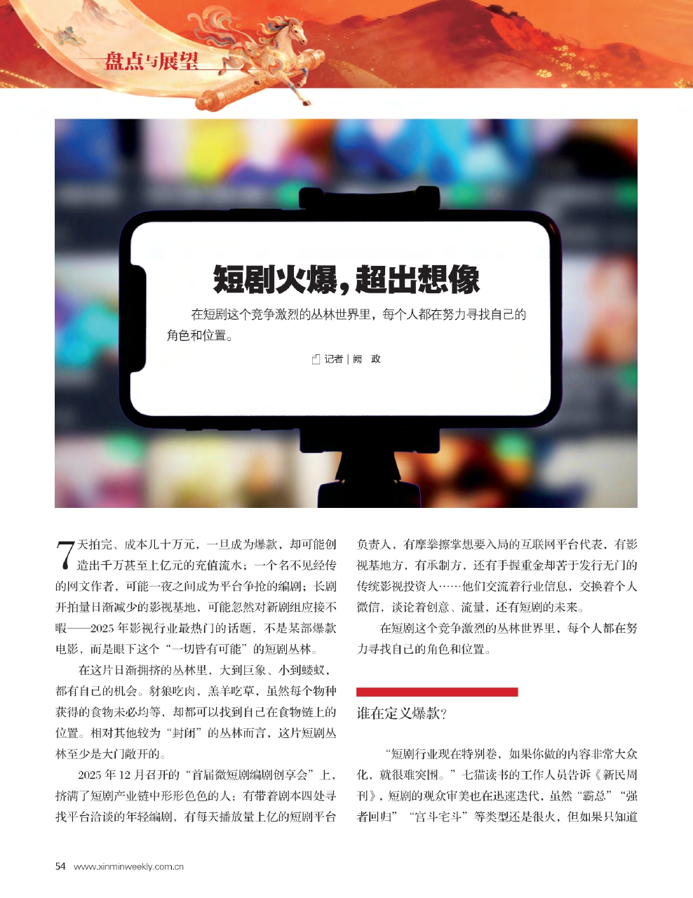 2024年,中国微短剧市场规模已达500亿元,首次超过全年电影票房。预计到2027年,这个数值更将突破1000亿元。这股新兴的短剧浪潮不仅重塑了观众看剧的习惯,也改变了影视行业一直以来的权力格局。从横店、象山的制作基地,发展到郑州、西安短剧承制新势力的崛起;从国内市场激烈内卷,到海外市场扬帆远航;从监管逐步收紧,到扶持政策出台,人才培养体系日渐完善……短剧行业正以前所未有的速度,完成着从边缘到主流、从草根到精英、从混乱到有序的进化。这片丛林的边界仍然在不断扩张,不断有新的“角色”正在入局。