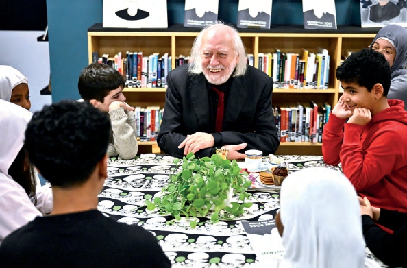 2025年12月12日,2025年诺贝尔文学奖得主、匈牙利作家克劳斯瑙霍尔考伊·拉斯洛访问林克比图书馆,与阅读其作品的孩子们会面。