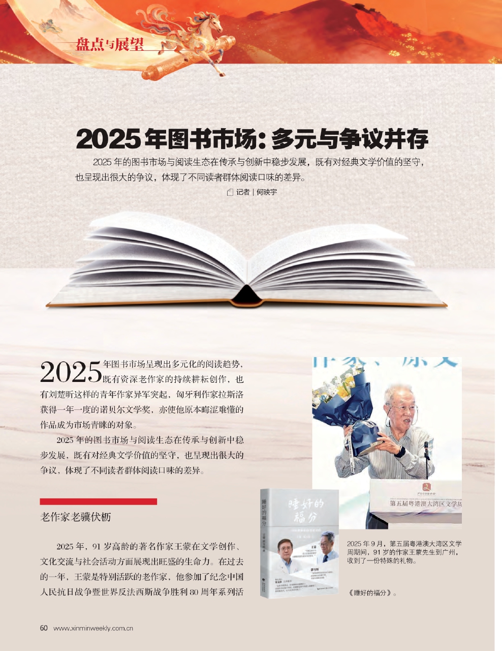 2025年,91岁高龄的著名作家王蒙在文学创作、文化交流与社会活动方面展现出旺盛的生命力。在过去的一年,王蒙是特别活跃的老作家,他参加了纪念中国人民抗日战争暨世界反法西斯战争胜利80周年系列活动,并在海峡两岸中华文化峰会等重要场合发表主旨演讲。其作品的影视化改编也取得进展,小说《奇葩奇葩处处哀》改编的电视剧《我的后半生》于2025年播出,长篇小说《这边风景》的电视剧改编也已通过备案。