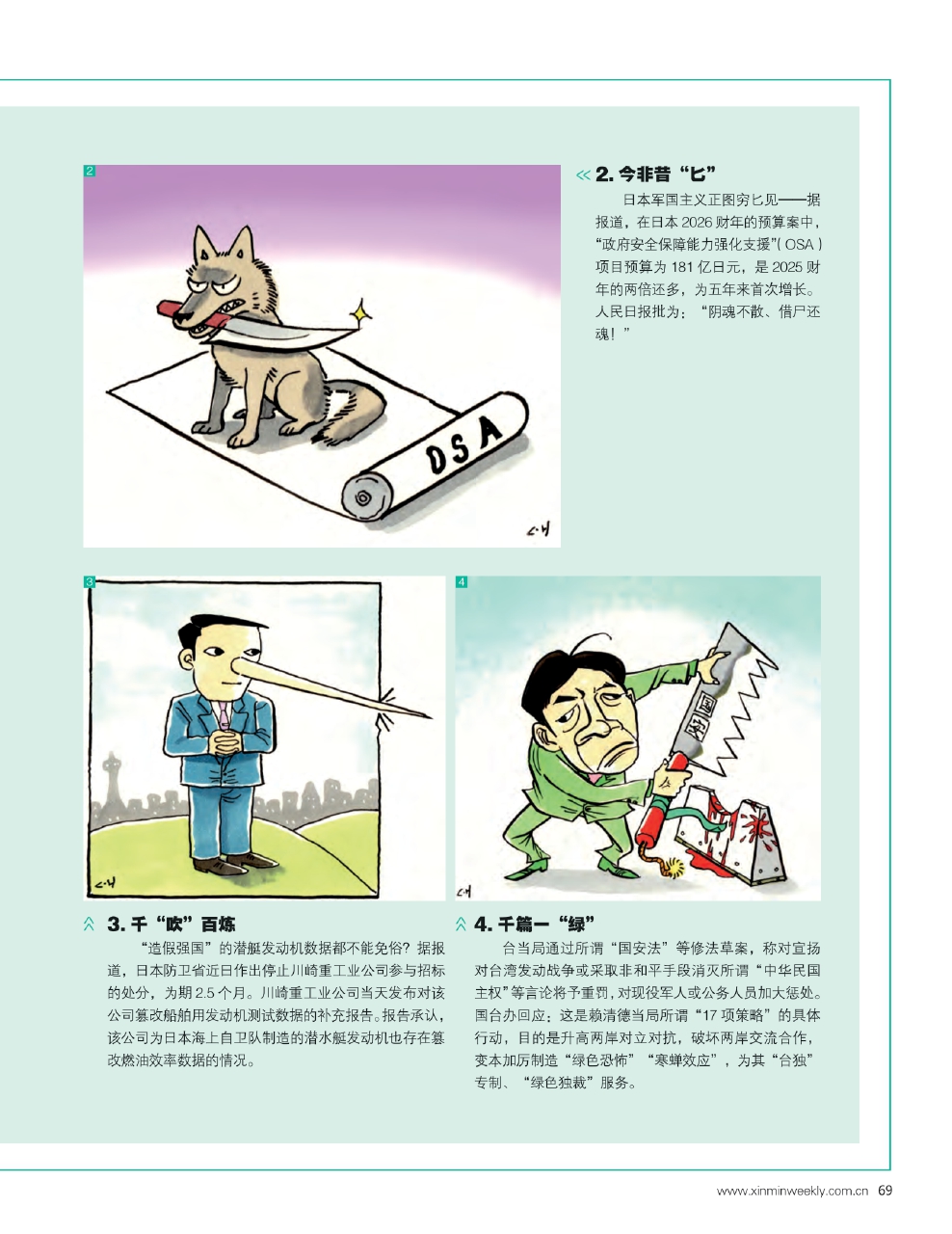 2.今非昔“匕” 日本军国主义正图穷匕见——据报道,在日本2026财年的预算案中,“政府安全保障能力强化支援”(OSA)项目预算为181亿日元,是2025财年的两倍还多,为五年来首次增长。人民日报批为:“阴魂不散、借尸还魂!”