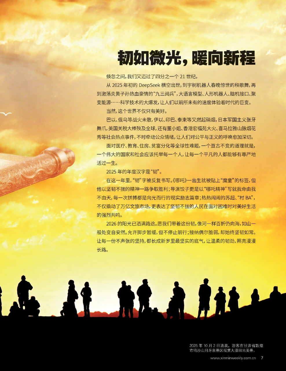在这一年里,“韧”字被反复书写。《哪吒》一出生就被贴上“魔童”的标签,但他以坚韧不拔的精神一路争取胜利;导演饺子更是以“哪吒精神”写就我命由我不由天,每一次拼搏都是向光而行的现实励志篇章;热热闹闹的苏超、“村BA”,不仅撬动了万亿文旅市场,更表达了坚韧不拔的人民在面对困难时对美好生活的强烈共鸣。