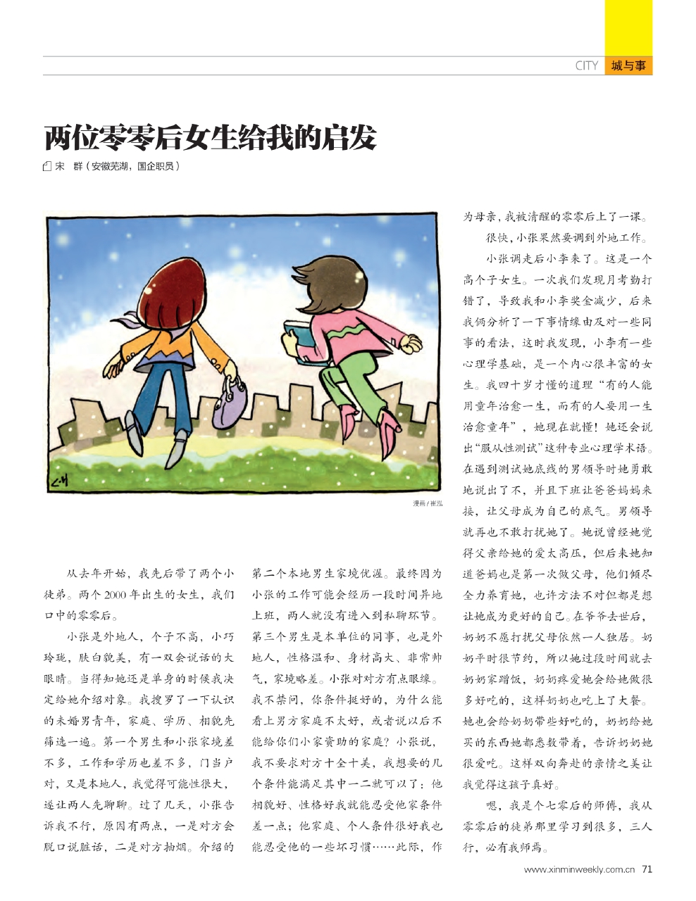 小张是外地人,个子不高,小巧玲珑,肤白貌美,有一双会说话的大眼睛。当得知她还是单身的时候我决定给她介绍对象。我搜罗了一下认识的未婚男青年,家庭、学历、相貌先筛选一遍。第一个男生和小张家境差不多,工作和学历也差不多,门当户对,又是本地人,我觉得可能性很大,遂让两人先聊聊。过了几天,小张告诉我不行,原因有两点,一是对方会脱口说脏话,二是对方抽烟。介绍的第二个本地男生家境优渥。最终因为小张的工作可能会经历一段时间异地上班,两人就没有进入到私聊环节。第三个男生是本单位的同事,也是外地人,性格温和、身材高大、非常帅气,家境略差。小张对对方有点眼缘。我不禁问,你条件挺好的,为什么能看上男方家庭不太好,或者说以后不能给你们小家资助的家庭?小张说,我不要求对方十全十美,我想要的几个条件能满足其中一二就可以了:他相貌好、性格好我就能忍受他家条件差一点;他家庭、个人条件很好我也能忍受他的一些坏习惯……此际,作为母亲,我被清醒的零零后上了一课。