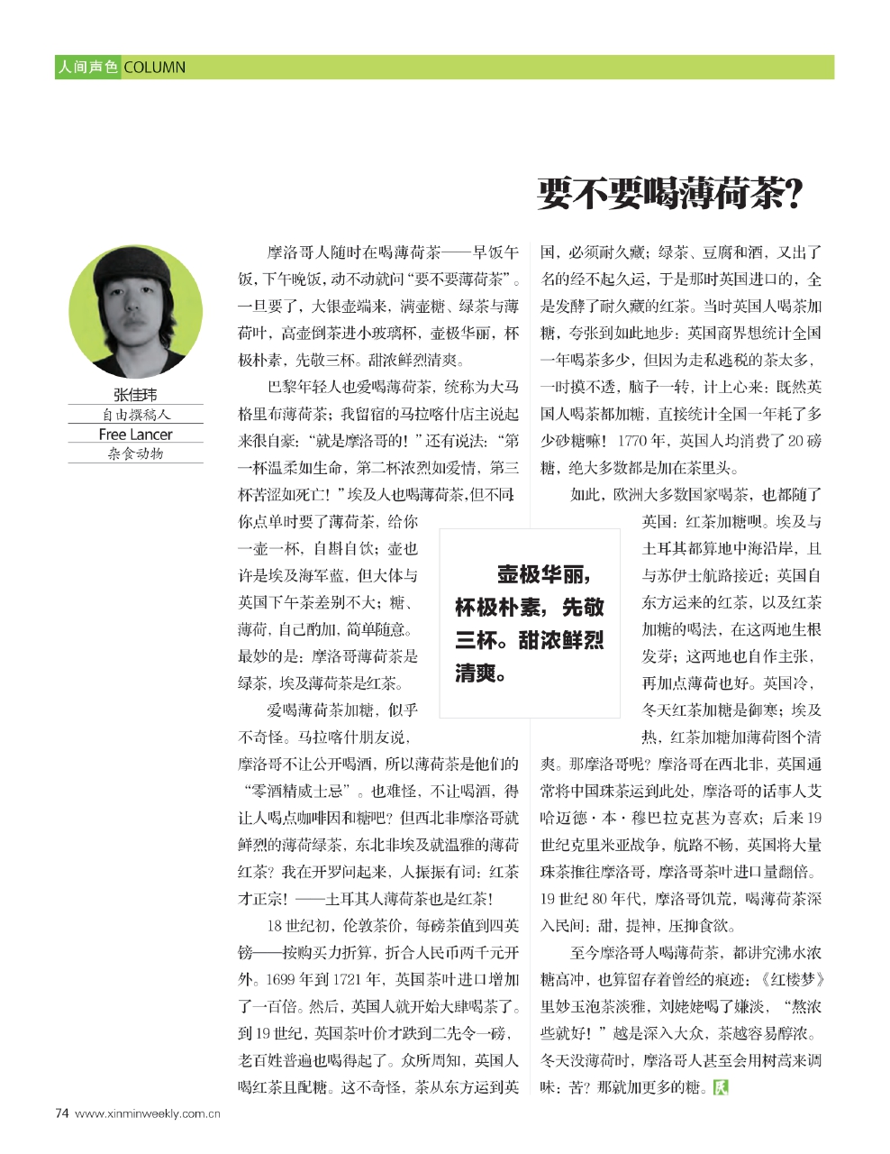 摩洛哥人随时在喝薄荷茶——早饭午饭,下午晚饭,动不动就问“要不要薄荷茶”。一旦要了,大银壶端来,满壶糖、绿茶与薄荷叶,高壶倒茶进小玻璃杯,壶极华丽,杯极朴素,先敬三杯。甜浓鲜烈清爽。