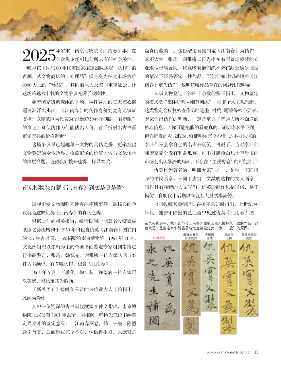 2025年岁末,南京博物院《江南春》事件在公众舆论场引起前所未有的社会关注。一幅早在上世纪60年代被国家鉴定团队认定“伪作”的古画,从文物商店的“处理品”摇身变为拍卖市场估价8800万元的“珍品”。其间的巨大反差与重重疑云,让这场跨越六十载的文物争议充满了戏剧性。