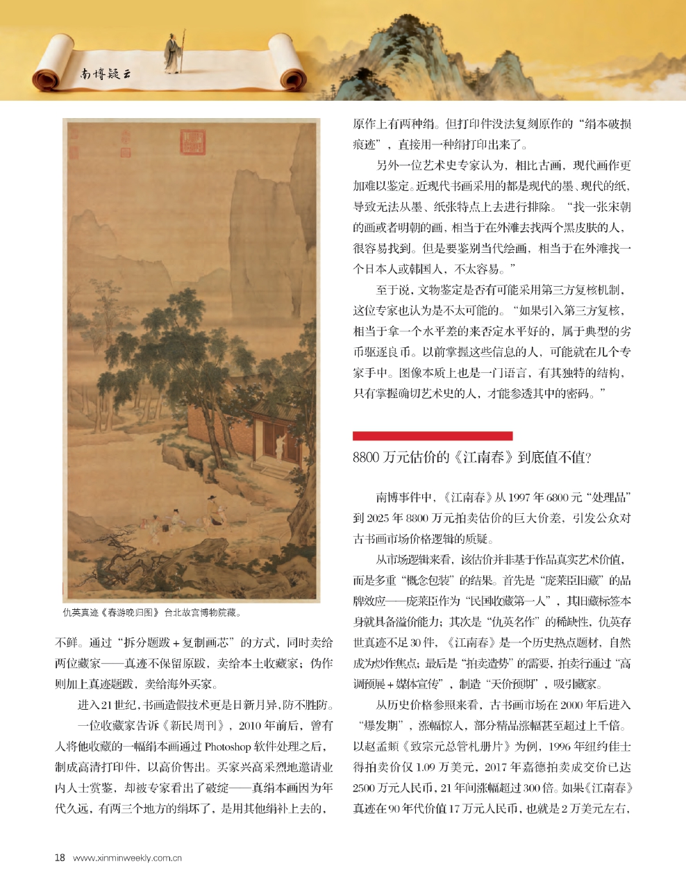 纵观引发文物圈强烈地震的南博事件,最核心的争议就是这幅仇英《江南春》的真伪之辨。