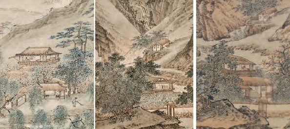 《江南春图》(左),此卷笔墨风貌与吴宏《清江行旅图》(中)、仇英款《摹李唐重江叠嶂图》(右)高度契合。