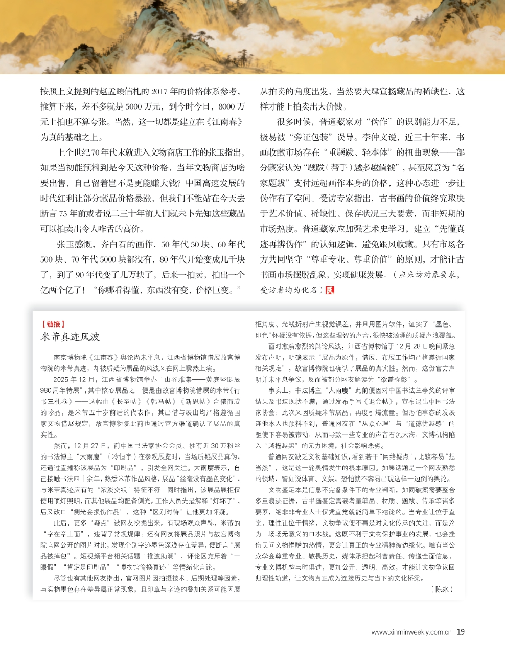 很多时候,普通藏家对“伪作”的识别能力不足,极易被“旁证包装”误导。李仲文说,近三十年来,书画收藏市场存在“重题跋、轻本体”的扭曲现象——部分藏家认为“题跋(帮手)越多越值钱”,甚至愿意为“名家题跋”支付远超画作本身的价格,这种心态进一步让伪作有了空间。受访专家指出,古书画的价值终究取决于艺术价值、稀缺性、保存状况三大要素,而非短期的市场热度。普通藏家应加强艺术史学习,建立“先懂真迹再辨伪作”的认知逻辑,避免跟风收藏。只有市场各方共同坚守“尊重专业、尊重价值”的原则,才能让古书画市场摆脱乱象,实现健康发展。(应采访对象要求,受访者均为化名)