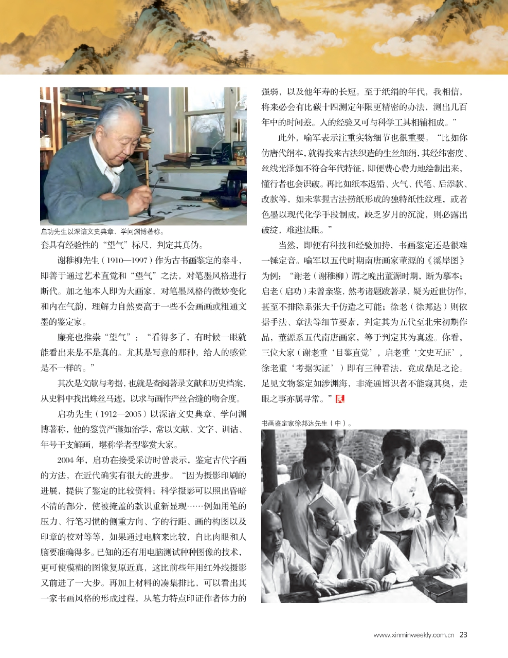 当然,即便有科技和经验加持,书画鉴定还是很难一锤定音。喻军以五代时期南唐画家董源的《溪岸图》为例:“谢老(谢稚柳)谓之晚出董源时期,断为摹本;启老(启功)未曾亲鉴,然考诸题跋著录,疑为近世仿作,甚至不排除系张大千仿造之可能;徐老(徐邦达)则依据手法、章法等细节要素,判定其为五代至北宋初期作品,董源系五代南唐画家,等于判定其为真迹。你看,三位大家(谢老重‘目鉴直觉’,启老重‘文史互证’,徐老重‘考据实证’)即有三种看法,竟成鼎足之论。足见文物鉴定如涉渊海,非淹通博识者不能窥其奥,走眼之事亦属寻常。”