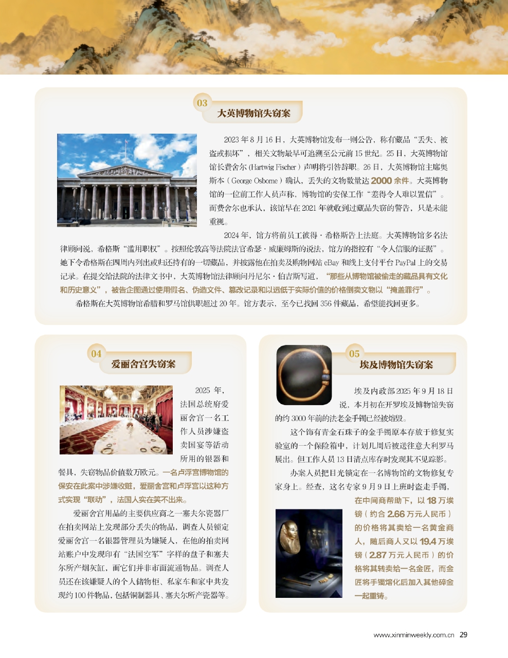 2023年8月16日,大英博物馆发布一则公告,称有藏品“丢失、被盗或损坏”,相关文物最早可追溯至公元前15世纪。25日,大英博物馆馆长费舍尔(Hartwig Fischer)声明将引咎辞职。26日,大英博物馆主席奥斯本(George Osborne)确认,丢失的文物数量达2000余件。大英博物馆的一位前工作人员声称,博物馆的安保工作“差得令人难以置信”。而费舍尔也承认,该馆早在2021年就收到过藏品失窃的警告,只是未能重视。