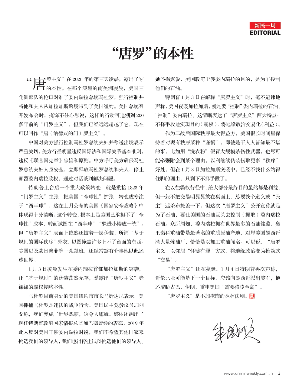 1月3日凌晨发生在委内瑞拉首都加拉加斯的突袭,让“基于规则”的伪装荡然无存,暴露出“唐罗主义”赤裸裸的霸权侵略本性。