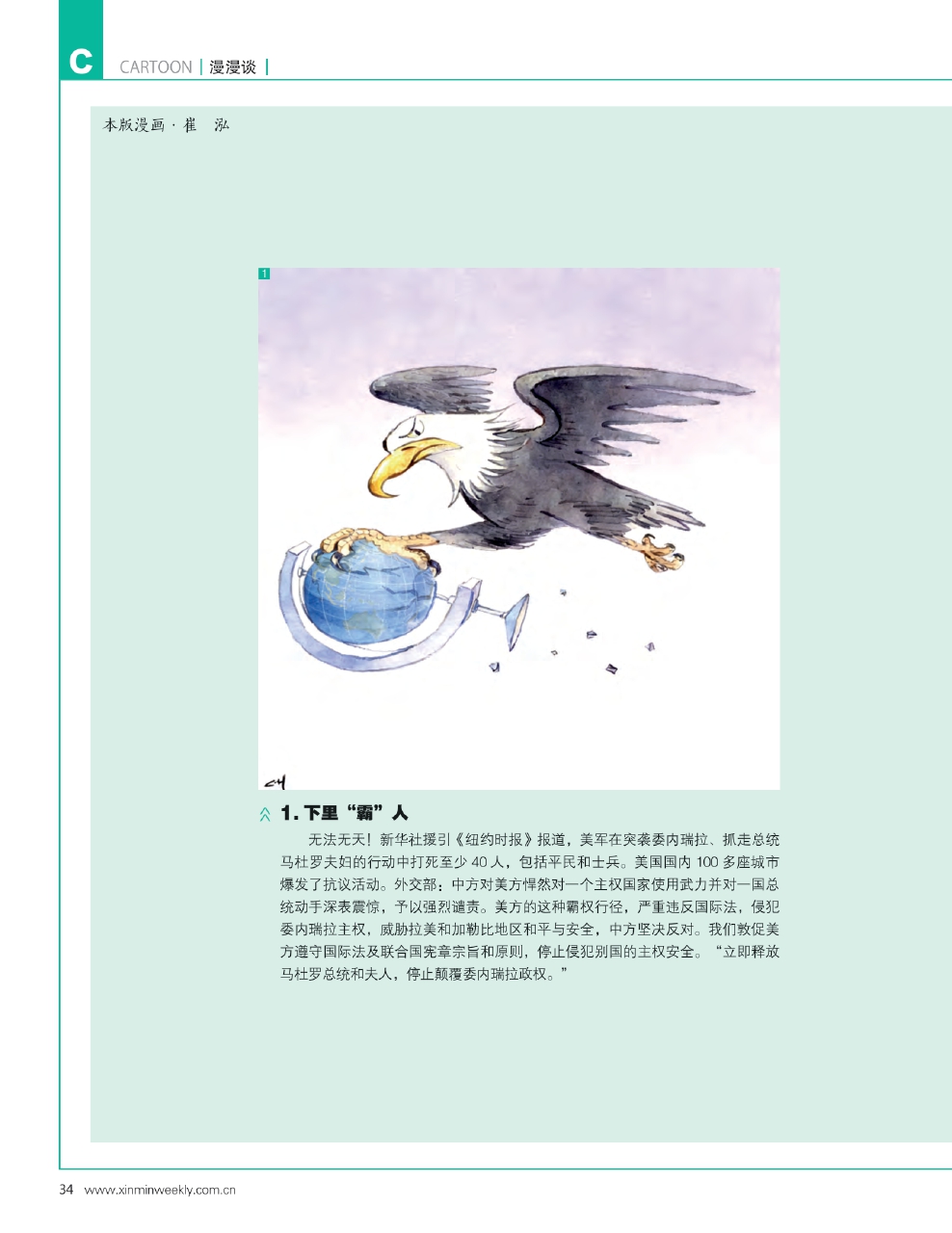 1.下里“霸”人 无法无天!新华社援引《纽约时报》报道,美军在突袭委内瑞拉、抓走总统马杜罗夫妇的行动中打死至少40人,包括平民和士兵。美国国内100多座城市爆发了抗议活动。外交部:中方对美方悍然对一个主权国家使用武力并对一国总统动手深表震惊,予以强烈谴责。美方的这种霸权行径,严重违反国际法,侵犯委内瑞拉主权,威胁拉美和加勒比地区和平与安全,中方坚决反对。我们敦促美方遵守国际法及联合国宪章宗旨和原则,停止侵犯别国的主权安全。“立即释放马杜罗总统和夫人,停止颠覆委内瑞拉政权。”