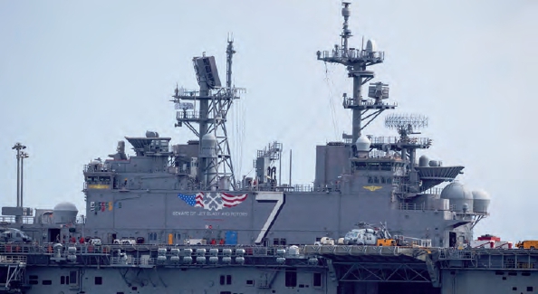 上图:2025年12月17日,波多黎各蓬塞市,美国海军硫磺岛号两栖攻击舰(LHD-7)停靠期间,舰员在折叠旋翼的MH-60S骑士鹰直升机旁行走。