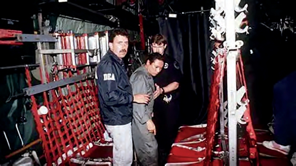 左图:1990年1月,诺列加将军(左二)被美国缉毒局抓捕。