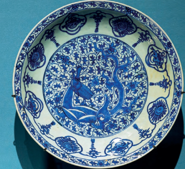 一幅诗会图釉面陶板特别值得推荐:两名男青年斗诗,一人正在写诗,另一人则在吟诵诗句。陶板可能源自伊斯法罕王室建筑群中的某座亭阁。类似的饰板常用于墙裙部位,其上方则绘有壁画。另一件伊朗的“龙纹瓶”,是伊斯兰艺术受东方美学影响的典范。朱迪思介绍道:“当时的伊朗陶瓷匠人借鉴了中国瓷器上的龙纹,但在模仿创作中赋予它新的性格。流传至伊朗后,原本流畅飘逸的中国龙形象,线条逐渐变得硬朗挺拔,展现出截然不同的艺术气质。”还有一组蓝白相间的陶瓷,其上绘有莲花、牡丹等变体纹样,体现了清雅的传统东方美学。“早在中世纪,中国纹样就已经对伊斯兰艺术产生影响。尤其中国瓷器,16到17世纪的瓷器曾是当地珍贵的奢侈品,只有王公贵族才能拥有。”朱迪思解释,“这直接激发了伊朗等地陶瓷业的创作,工匠们学习、模仿,中国瓷器成为当时的‘时髦货’。”伊兹尼克初期的蓝白纹饰便是仿照当时中国瓷器的风格。毋庸置疑,这些艺术品是昔日“丝绸之路”的珍贵历史遗产。今天,它们降临至黄浦江畔的浦东美术馆,将为“一带一路”倡议注入新的能量。