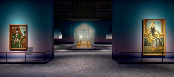沿着展厅的动线前行,色调逐渐由温暖的淡红过渡至深邃的蓝紫,伊朗萨法维王朝的风貌在这里缓缓铺开,生动诠释了萨法维王朝和卡扎尔王朝纷繁的艺术成就。1501年,沙阿伊斯玛仪一世建立萨法维王朝,以今伊朗为中心,版图从亚美尼亚延伸至阿富汗。贯通东西的商贸推动了艺术发展的高度繁荣,缔造了一个艺术创作的黄金时代:铭诗盘、兽斗纹圆形饰板等彩陶器不仅具有实用价值,更承载了文学母题和诗歌意象,堪称“会说话的艺术品”;动植物纹瓶等彰显出华丽的“拉斯特彩”陶瓷装饰技术,同时体现出中国青花瓷的纹样如何融入萨法维艺术语言;王室与贵族的肖像油画展现了本土艺术家吸收欧洲绘画技术后的进化与突破;这一时期广泛流行的珐琅工艺也被运用至当地特色水烟壶的制作当中。19世纪,卡扎尔王朝统治下的伊朗更是视萨法维时期的艺术为典范。工匠们从历史和文学中汲取灵感,这一潮流强化了民族认同感,并唤醒了辉煌的过去。