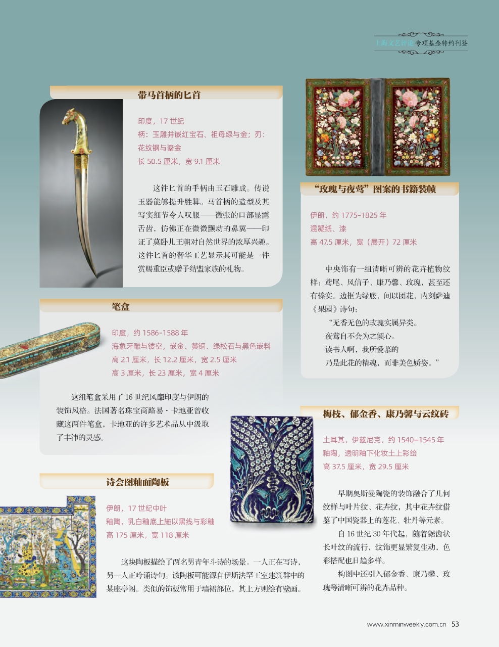 这组笔盒采用了16世纪风靡印度与伊朗的装饰风格。法国著名珠宝商路易·卡地亚曾收藏这两件笔盒,卡地亚的许多艺术品从中汲取了丰沛的灵感。