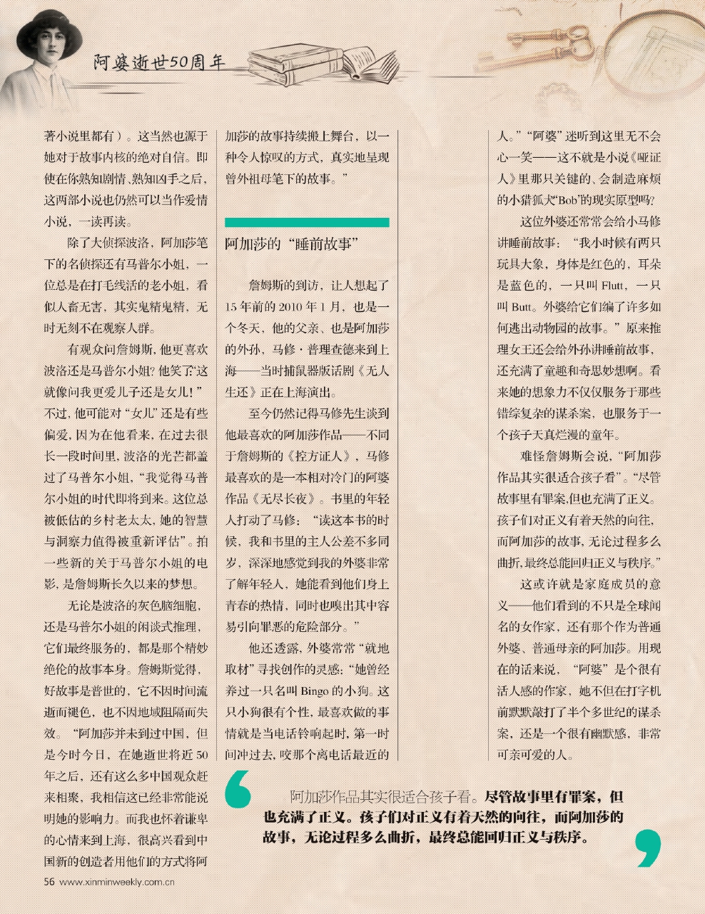 难怪詹姆斯会说,“阿加莎作品其实很适合孩子看”。“尽管故事里有罪案,但也充满了正义。孩子们对正义有着天然的向往,而阿加莎的故事,无论过程多么曲折,最终总能回归正义与秩序。”