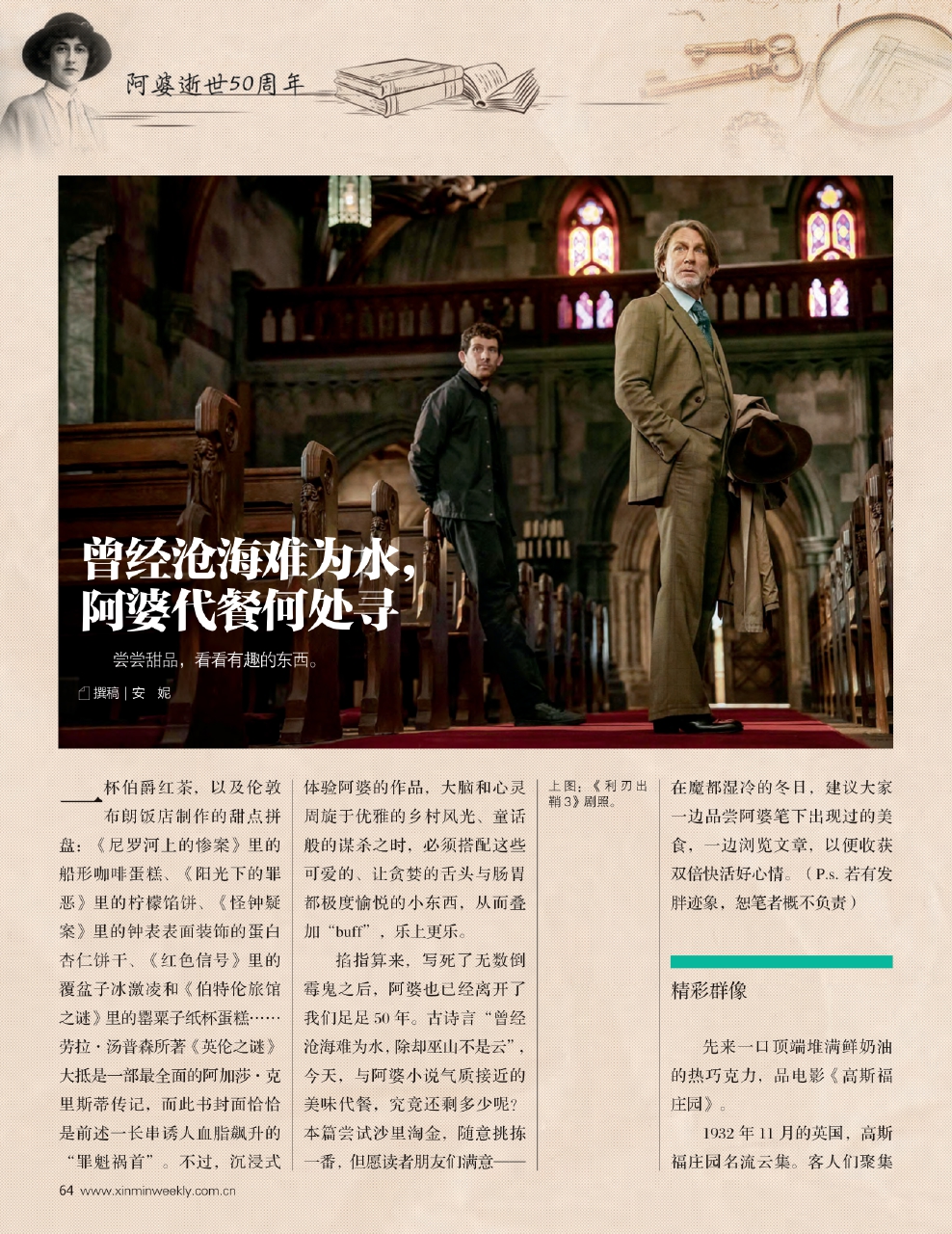 总之,当喧嚣、无序的现代社会扑面而来,阿婆对其间的轻浮、胆怯、自私、无良早早提出警告。我们也和阿婆一样,宁愿跟随马普尔小姐一起住进伯特伦旅馆——一个纯粹的爱德华七世的标志性建筑,重温青春年华,再次走进真正无忧无虑惩奸除恶的黄金岁月。旅馆的休息大厅里,炉火燃烧着,桌上摆好了刚出炉的热饮和抹上了厚厚黄油的吐司……我们还想对阿婆深情表白:代餐那么多,可您永远是“女王”,无人能比。