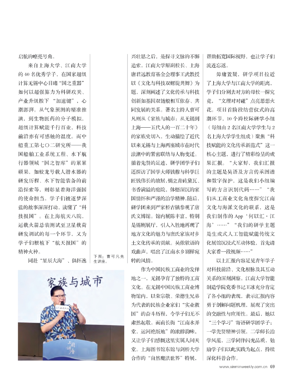 上海市委宣传部原副部长、上海大学海派文化研究中心主任陈东,更以一场微讲座升华了研学的内涵。她讲述了爱国实业家唐翔千先生所在的唐氏家族捐资助学、心系桑梓,以及无锡王氏家族的杰出代表人物在改革开放中贡献卓著的动人故事,诠释了一脉相承的爱国爱港情怀及其历史传承。面对在场学子,她深刻发问“青春如何不负?青春在哪里用力?青春怎样出彩?”,勉励学子在老前辈精神的指引下,珍惜江南这方热土提供的成长机遇,勇敢解答时代赋予的“青春三问”,以爆发性的知识增长和实际行动不负韶华。