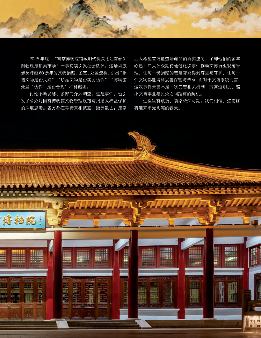 2025年底,“南京博物院馆藏明代仇英《江南春》图卷现身拍卖市场”一事持续引发社会热议。这场风波涉及跨越60余年的文物捐赠、鉴定、处置流程,引出“捐赠文物是否失踪”“珍品文物是否实为伪作”“博物馆处置‘伪作’是否合规”种种谜团。