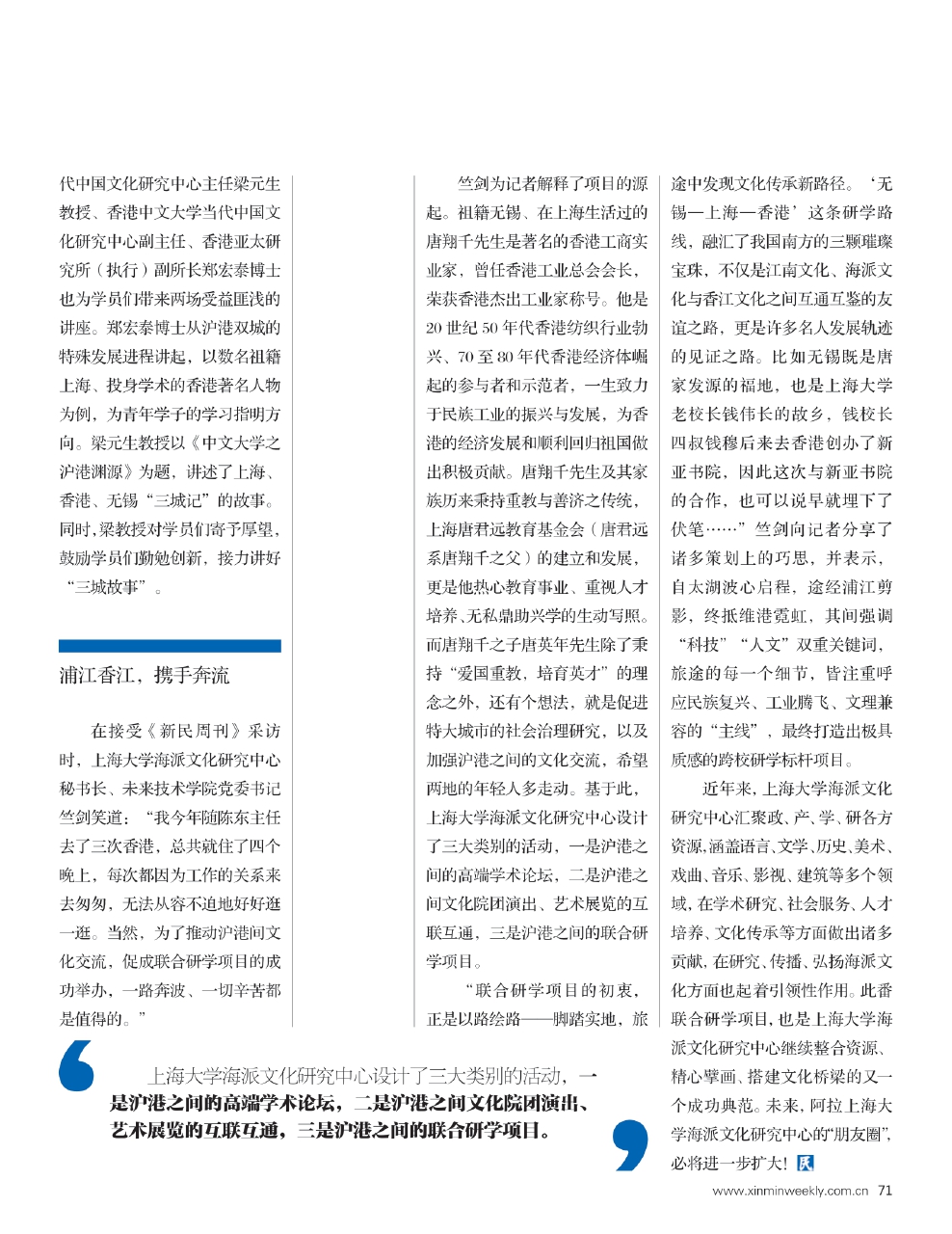 在接受《新民周刊》采访时,上海大学海派文化研究中心秘书长、未来技术学院党委书记竺剑笑道:“我今年随陈东主任去了三次香港,总共就住了四个晚上,每次都因为工作的关系来去匆匆,无法从容不迫地好好逛一逛。当然,为了推动沪港间文化交流,促成联合研学项目的成功举办,一路奔波、一切辛苦都是值得的。”