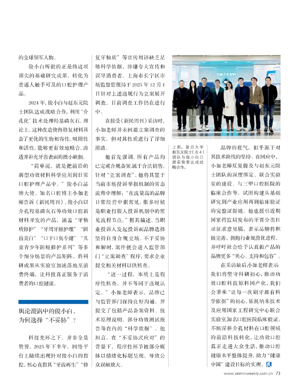“简单说,就是把前沿的新型功效材料科学应用到日常口腔护理产品中。”俊小白品牌大使、知名口腔博主小如老师告诉《新民周刊》,俊小白以介孔羟基磷灰石等功效口腔新材料开发的产品,涵盖“牙釉质修护”“牙周牙龈护理”“固齿美白”“口干口臭专健”“儿童青少年防蛀修护系列”等多个细分场景的产品矩阵,将科研成果从实验室加速落地至消费终端,让科技真正服务于消费者的口腔健康。