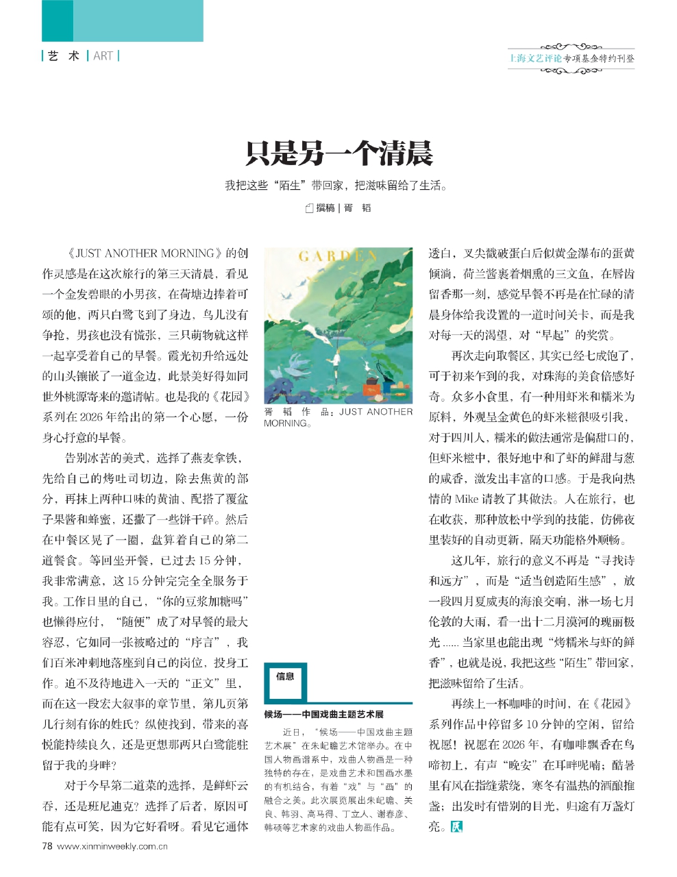 《JUST ANOTHER MORNING》的创作灵感是在这次旅行的第三天清晨,看见一个金发碧眼的小男孩,在荷塘边捧着可颂的他,两只白鹭飞到了身边,鸟儿没有争抢,男孩也没有慌张,三只萌物就这样一起享受着自己的早餐。霞光初升给远处的山头镶嵌了一道金边,此景美好得如同世外桃源寄来的邀请帖。也是我的《花园》系列在2026年给出的第一个心愿,一份身心抒意的早餐。