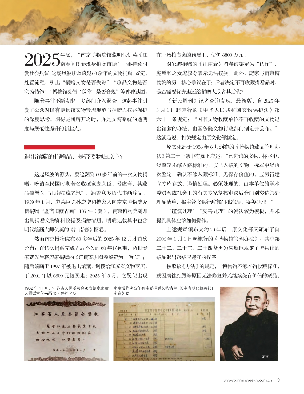 然而南京博物院在60多年后的2025年12月才首次公布:在这次捐赠完成之后不久的60年代初期,两批专家就先后将庞家捐赠的《江南春》图卷鉴定为“伪作”;随后该画于1997年被退出馆藏,划拨给江苏省文物商店,于2001年以6800元被买走;2025年5月,它疑似出现在一场拍卖会的预展上,估价8800万元。