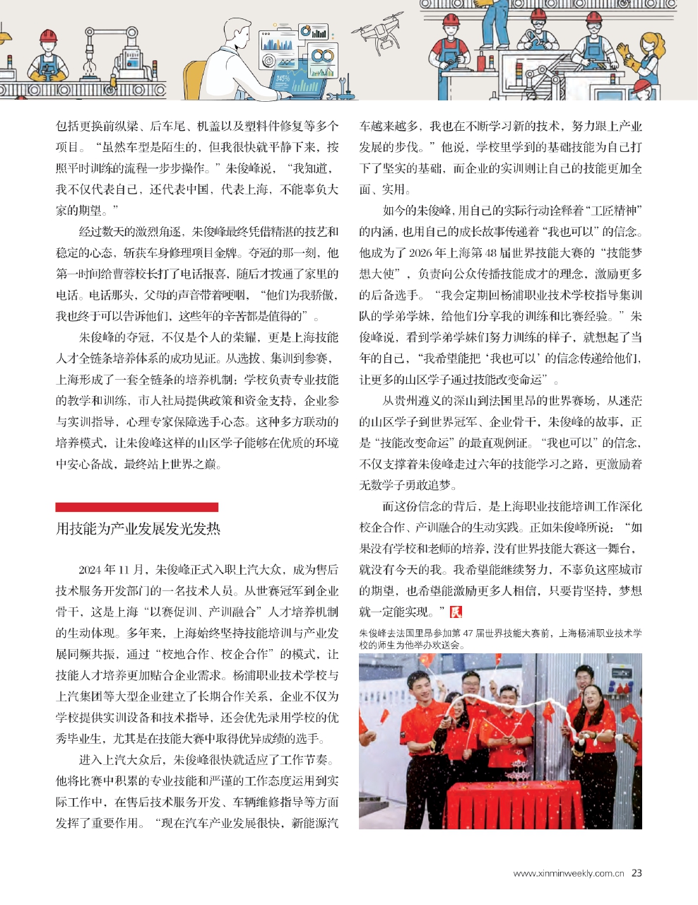 如今的朱俊峰,用自己的实际行动诠释着“工匠精神”的内涵,也用自己的成长故事传递着“我也可以”的信念。他成为了2026年上海第48届世界技能大赛的“技能梦想大使”,负责向公众传播技能成才的理念,激励更多的后备选手。“我会定期回杨浦职业技术学校指导集训队的学弟学妹,给他们分享我的训练和比赛经验。”朱俊峰说,看到学弟学妹们努力训练的样子,就想起了当年的自己,“我希望能把‘我也可以’的信念传递给他们,让更多的山区学子通过技能改变命运”。