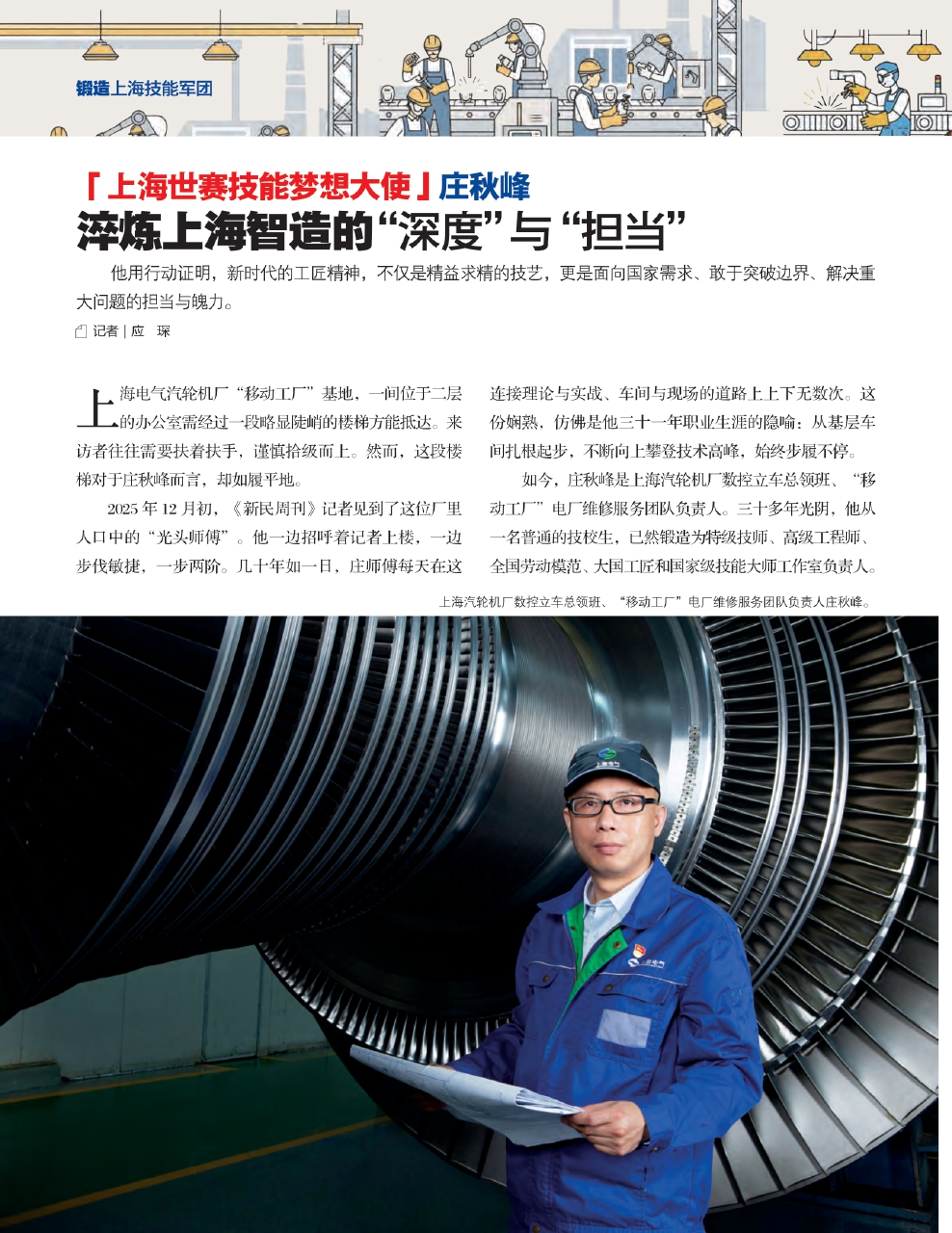 如今,庄秋峰是上海汽轮机厂数控立车总领班、“移动工厂”电厂维修服务团队负责人。三十多年光阴,他从一名普通的技校生,已然锻造为特级技师、高级工程师、全国劳动模范、大国工匠和国家级技能大师工作室负责人。