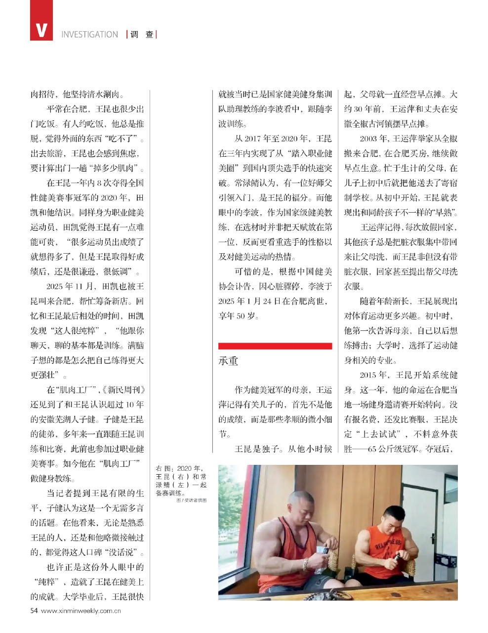在王昆意外去世10天后,《新民周刊》记者来到他生前在安徽合肥开办的健身馆——“肌肉工厂”。在这里,记者见到了王昆母亲王运萍,还有王昆好友、同为职业健美选手的常渌鲭与田凯。在这里,没有网络舆论纷争,只是安静地留存一个真相:年轻的生命真实地努力过,直到戛然而止。