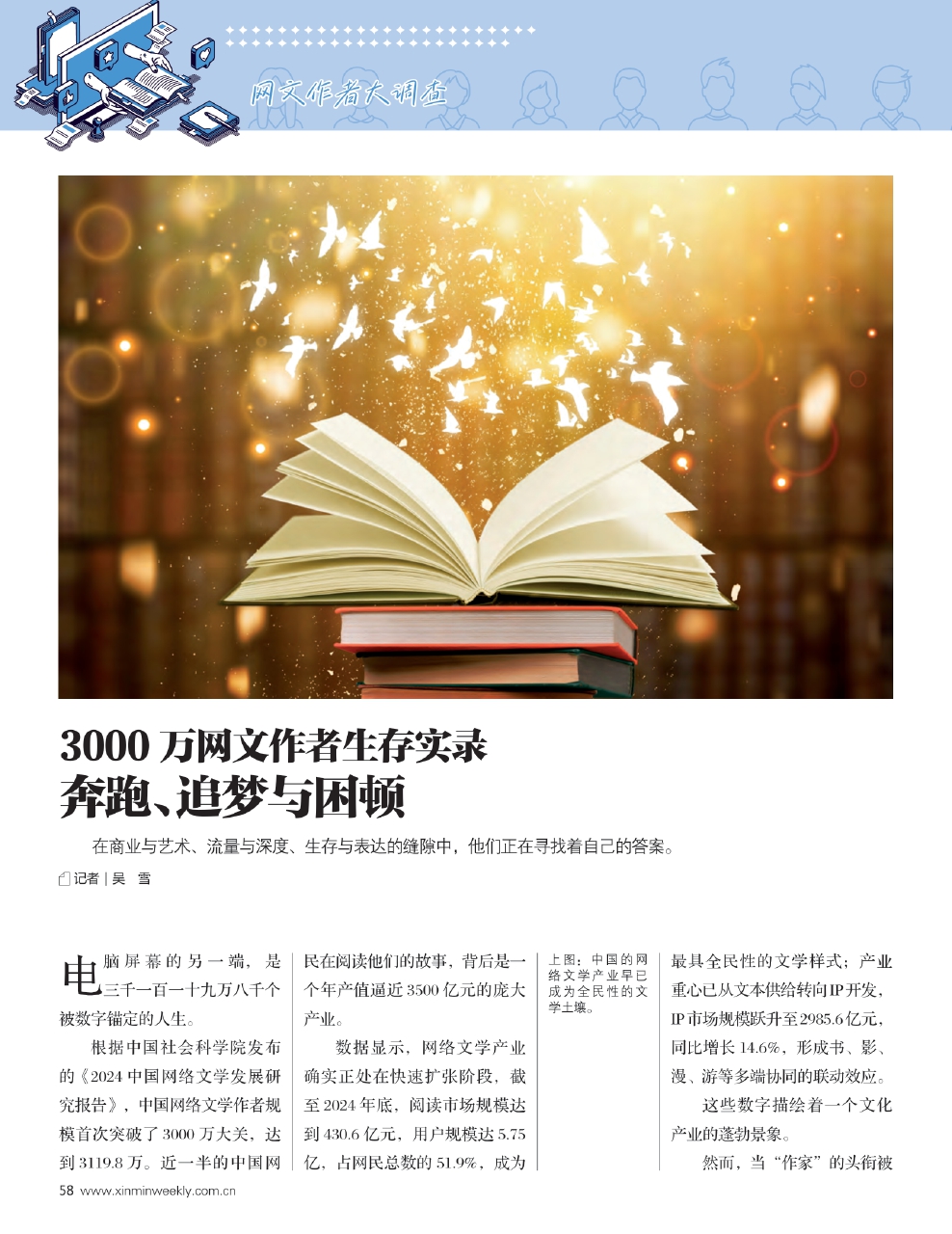 这些不仅是虚构的故事,也是作者自身的生存隐喻。《新民周刊》通过多角度人物采访,试图拼凑出这一群体的生活状态、创作困境与精神追求,还原网文作家的真实生存实录,在商业与艺术、流量与深度、生存与表达的缝隙中,他们正在寻找着自己的答案。