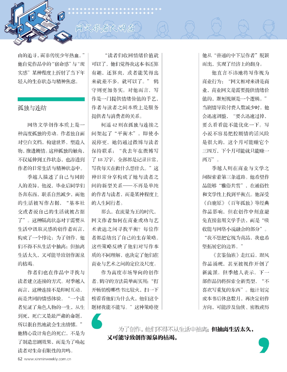 这些不仅是虚构的故事,也是作者自身的生存隐喻。《新民周刊》通过多角度人物采访,试图拼凑出这一群体的生活状态、创作困境与精神追求,还原网文作家的真实生存实录,在商业与艺术、流量与深度、生存与表达的缝隙中,他们正在寻找着自己的答案。