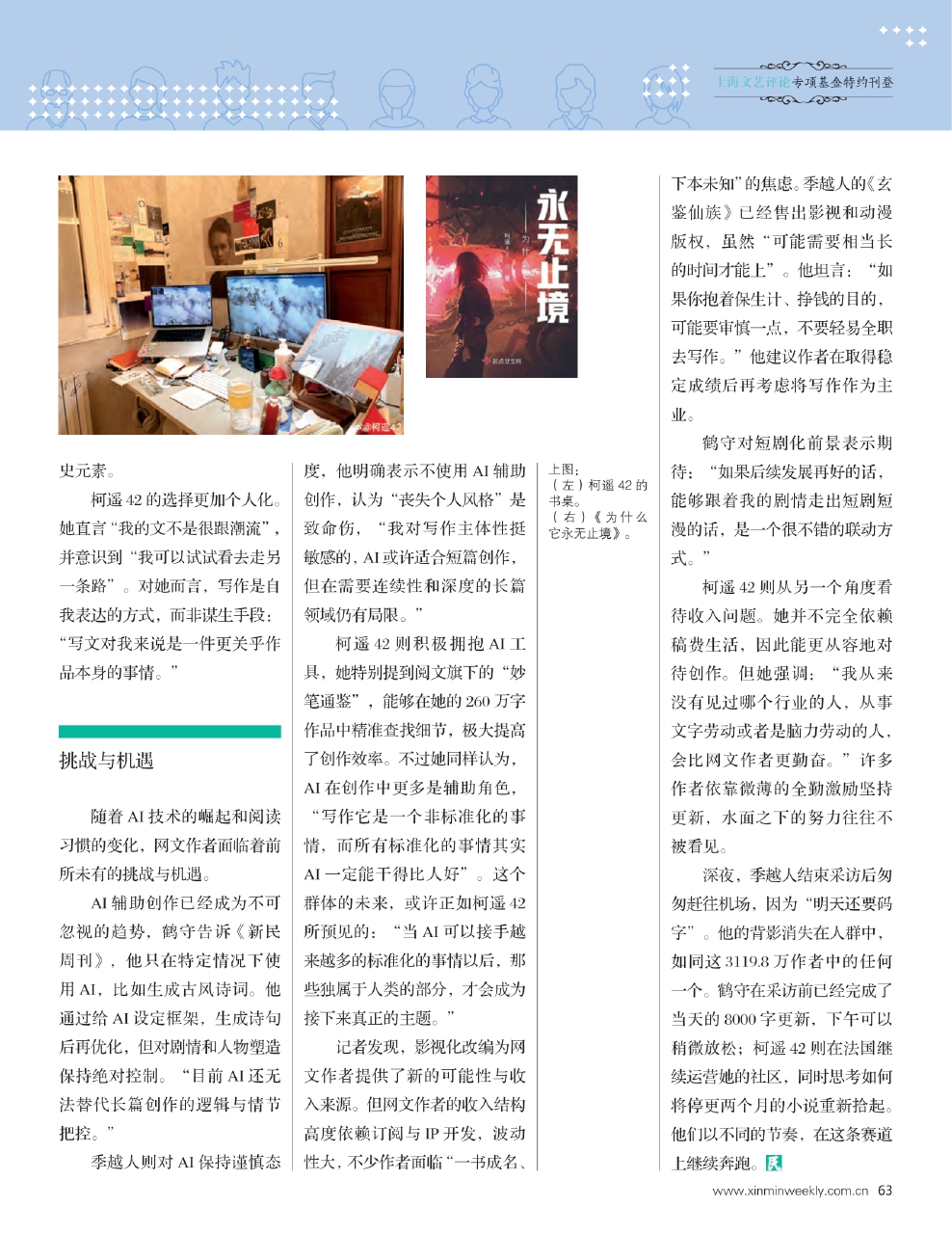 柯遥42则积极拥抱AI工具,她特别提到阅文旗下的“妙笔通鉴”,能够在她的260万字作品中精准查找细节,极大提高了创作效率。不过她同样认为,AI在创作中更多是辅助角色,“写作它是一个非标准化的事情,而所有标准化的事情其实AI一定能干得比人好”。这个群体的未来,或许正如柯遥42所预见的:“当AI可以接手越来越多的标准化的事情以后,那些独属于人类的部分,才会成为接下来真正的主题。”
