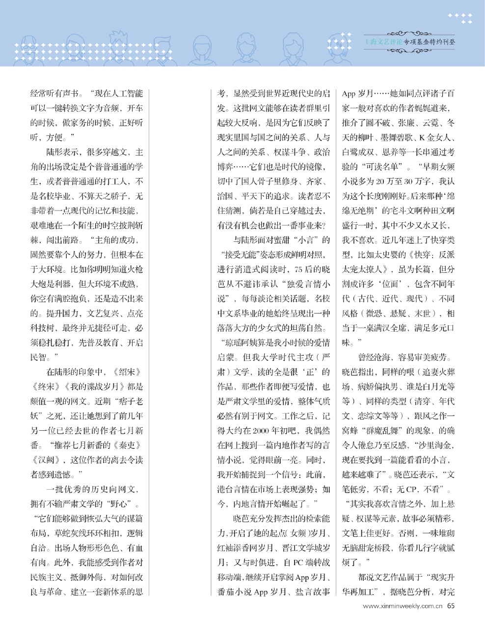 晓芭充分发挥杰出的检索能力,开启了她的起点(女频)岁月、红袖添香网岁月、晋江文学城岁月;又与时俱进,自PC端转战移动端,继续开启掌阅App岁月、番茄小说App岁月、盐言故事App岁月……她如同点评诸子百家一般对喜欢的作者娓娓道来,推介了圆不破、张廉、云霓、冬天的柳叶、墨舞碧歌、K金女人、白鹭成双、恩养等一长串通过考验的“可读名单”。“早期女频小说多为20万至30万字,我认为这个长度刚刚好。后来那种‘绵绵无绝期’的宅斗文啊种田文啊盛行一时,其中不少又水又长,我不喜欢。近几年迷上了快穿类型,比如太史婴的《快穿:反派太宠太撩人》,虽为长篇,但分割成许多‘位面’,包含不同年代(古代、近代、现代)、不同风格(微恐、悬疑、末世),相当于一桌满汉全席,满足多元口味。”