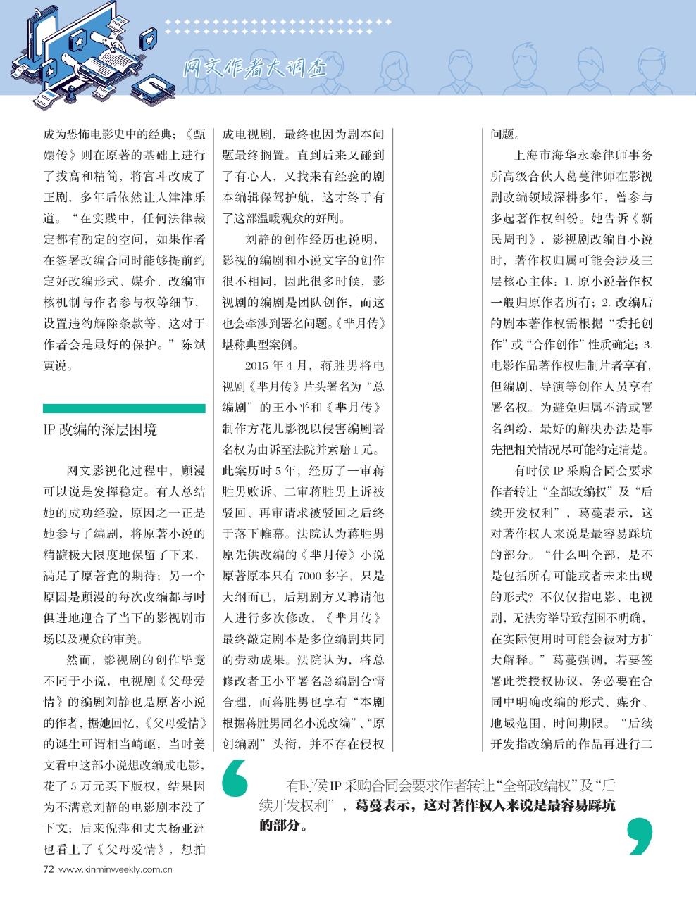 上海市海华永泰律师事务所高级合伙人葛蔓律师在影视剧改编领域深耕多年,曾参与多起著作权纠纷。她告诉《新民周刊》,影视剧改编自小说时,著作权归属可能会涉及三层核心主体:1.原小说著作权一般归原作者所有;2.改编后的剧本著作权需根据“委托创作”或“合作创作”性质确定;3.电影作品著作权归制片者享有,但编剧、导演等创作人员享有署名权。为避免归属不清或署名纠纷,最好的解决办法是事先把相关情况尽可能约定清楚。