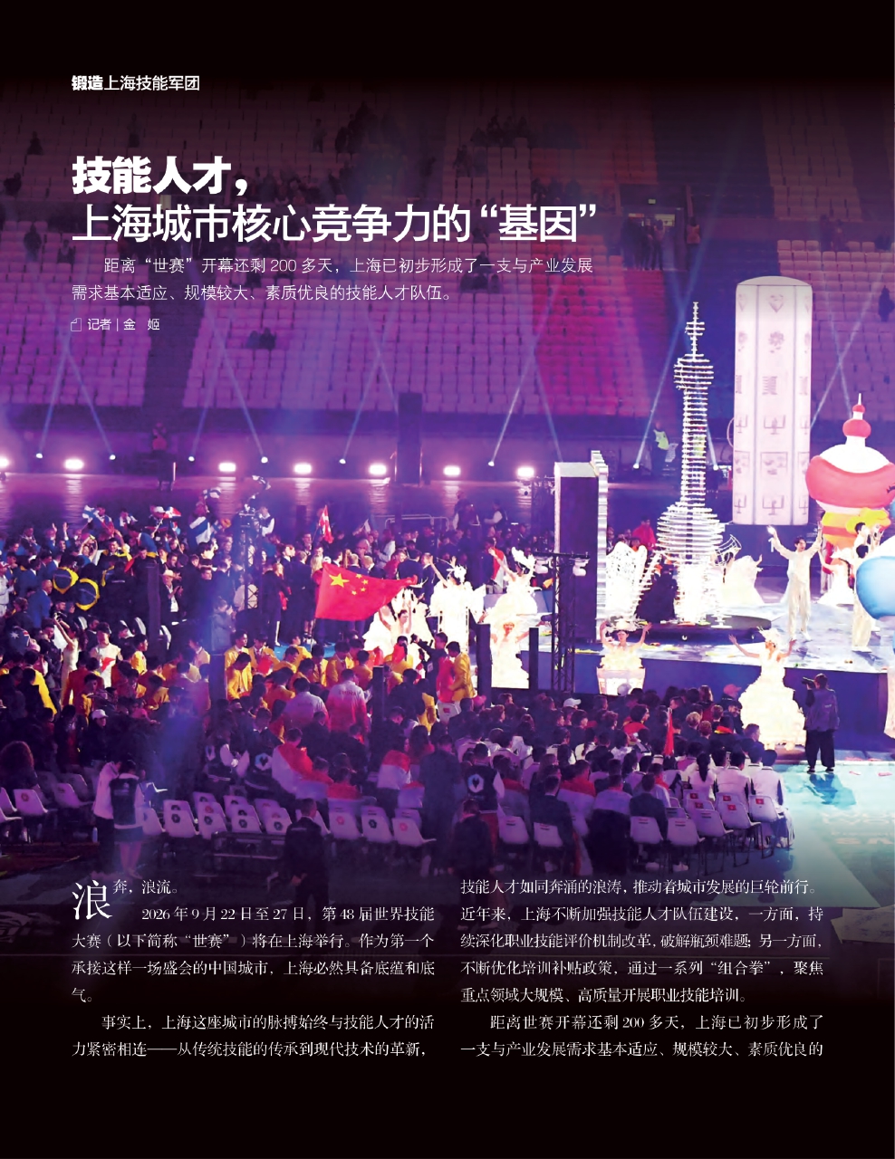 距离世赛开幕还剩200多天,上海已初步形成了一支与产业发展需求基本适应、规模较大、素质优良的技能人才队伍。全市技能人才总量达400余万人,占从业人员比例近39%,高技能人才占技能人才比例超过35%。正如上海市人力资源和社会保障局党组书记、局长,上海第48届世界技能大赛事务执行局常务副局长杨佳瑛所说:“期待2026年的上海,为世界奉献一场‘富有新意、影响广泛’的技能盛宴,不断提升中国在全球技能领域的话语权和影响力。同时,我们将进一步释放世赛的溢出效应,推动在技能人才培养、产业升级发展、技能氛围营造、绿色可持续发展等领域的成果转化。”