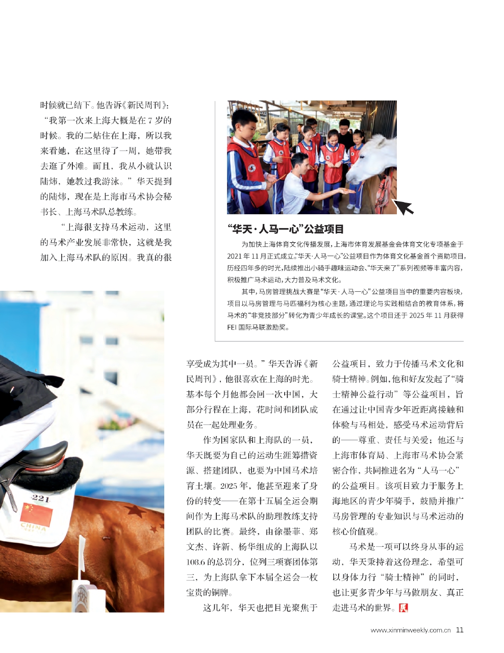 在2025年12月的一个周末傍晚,这位身高1米9的中英混血儿在上海外滩FTC接受了《新民周刊》的专访。在一个多小时的交流中,华天的坦诚和对马术运动的热爱,让我们感受到他由内而外的绅士风度,以及“鲜衣怒马少年时,不负韶华行且知”的境界。